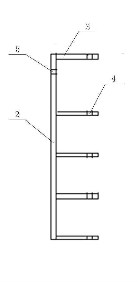 基板2采用寬70mm、厚5mm的扁鋼,基板2的長度可根據(jù)實(shí)際需要進(jìn)行設(shè)置,本實(shí)用新型優(yōu)選基板2長度為330mm。隔板1采用長100mm、寬70mm、厚5mm 的鋼板垂直焊接于基板2表面,最頂端隔板與第二隔板的間距為90mm,其余隔板的間距為60mm。插銷1可以穿過所有隔板1上的插銷孔4,將電纜限制于格狀空間內(nèi),保證電纜不會掉落,插銷1長度為360mm。