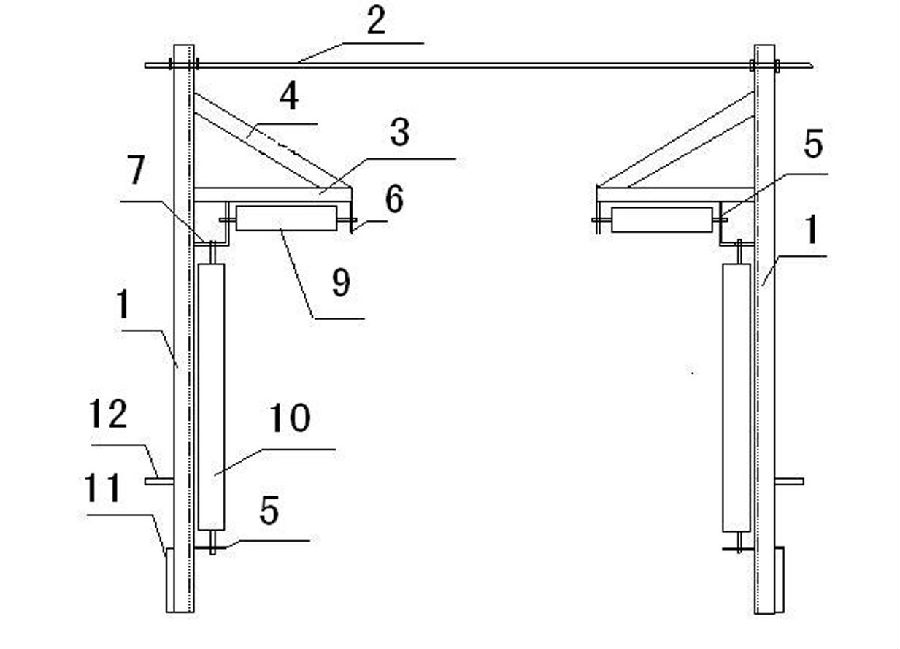 圖中:1-槽鋼、2-固定拉桿、3-托輥固定架、4-加強筋、5-托輥固定板Ⅰ、6-托輥固定板Ⅱ、7-托輥固定板Ⅲ、8-托輥固定板Ⅳ、9-壓帶輪、10-跑偏輪、11-固定板、12-輔助固定板。