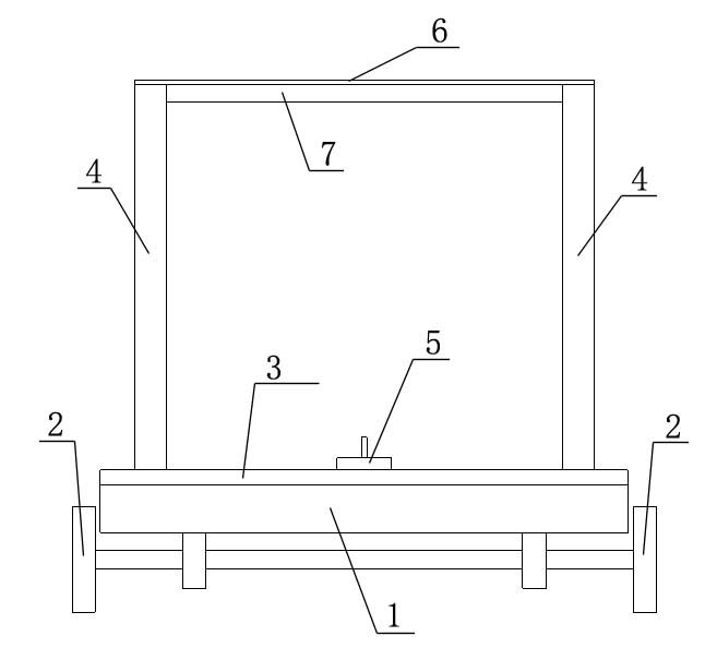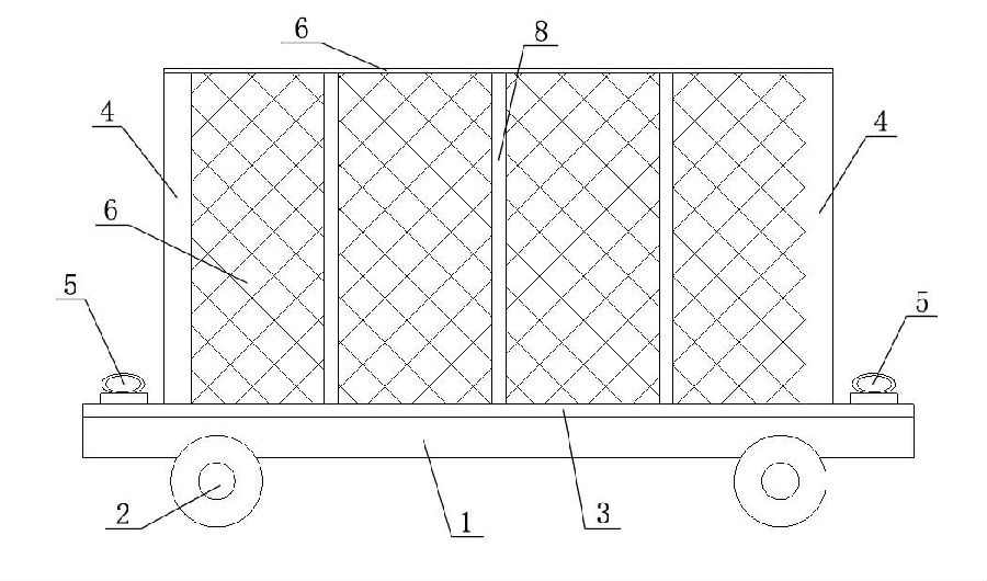 圖中:1-底盤框架、2-輪對、3-底板、4-主柱腿、5-連接耳、6-圓鋼網片、7-扁梁、8-輔柱腿。