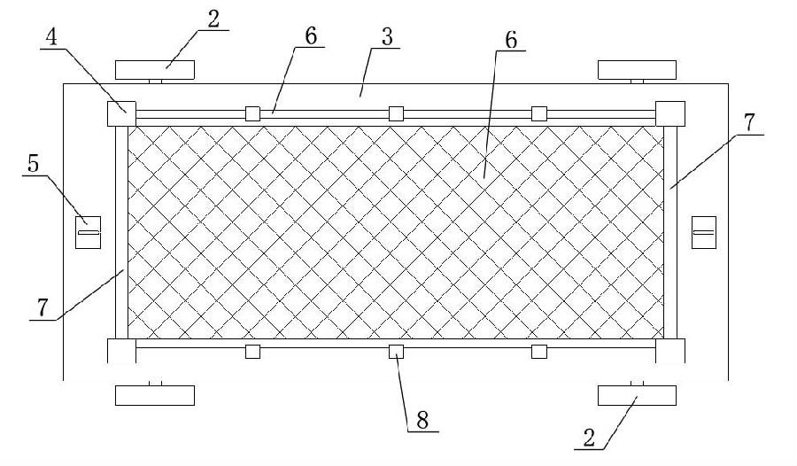 進一步地,在底板3的左右兩側位于主柱腿4之間的位置均布有若干根與底板3垂直固定的輔柱腿8,同時輔柱腿8也與固定于主柱腿4之間的圓鋼網片6固定。