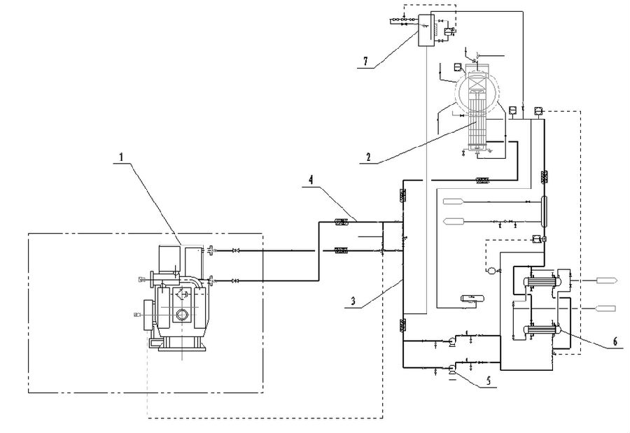 圖中,1-溴化鋰制冷機(jī)組,2-高壓洗滌器,3-主路,4-旁路,5-高調(diào)水泵,6-高調(diào)水冷器,7-高位水箱。