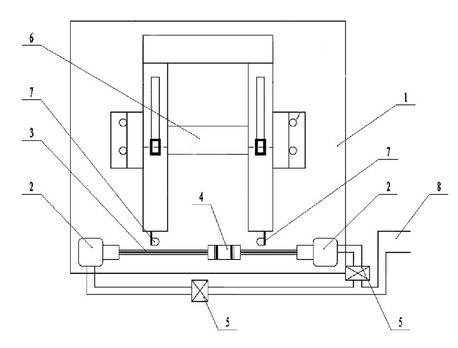 圖中,1-絞車底座,2-風泵,3-絲杠,4-排繩夾,5-電磁閥,6-絞車滾筒,7-限位器,8-總風管。