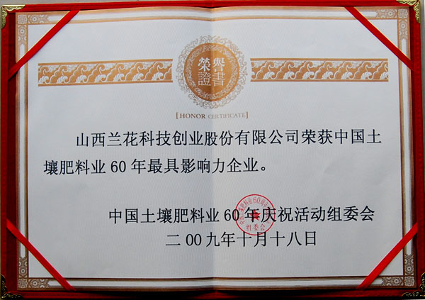 2009年10月,公司榮獲“中國土地肥料業60年最具影響力企業”