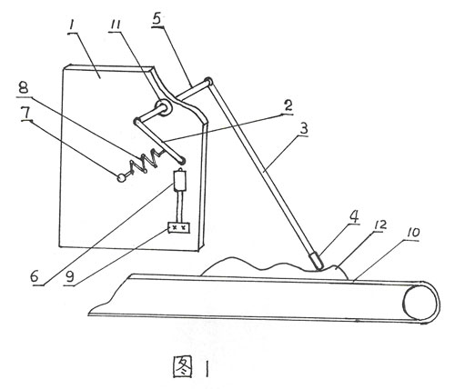 圖中:1、殼體,2、連動桿,3、檢測桿,4、測料頭,5、轉動軸,6、行程開關,7、固定點,8、彈簧,9、接線端子,10、皮帶機皮帶,11、軸承,12、物料。